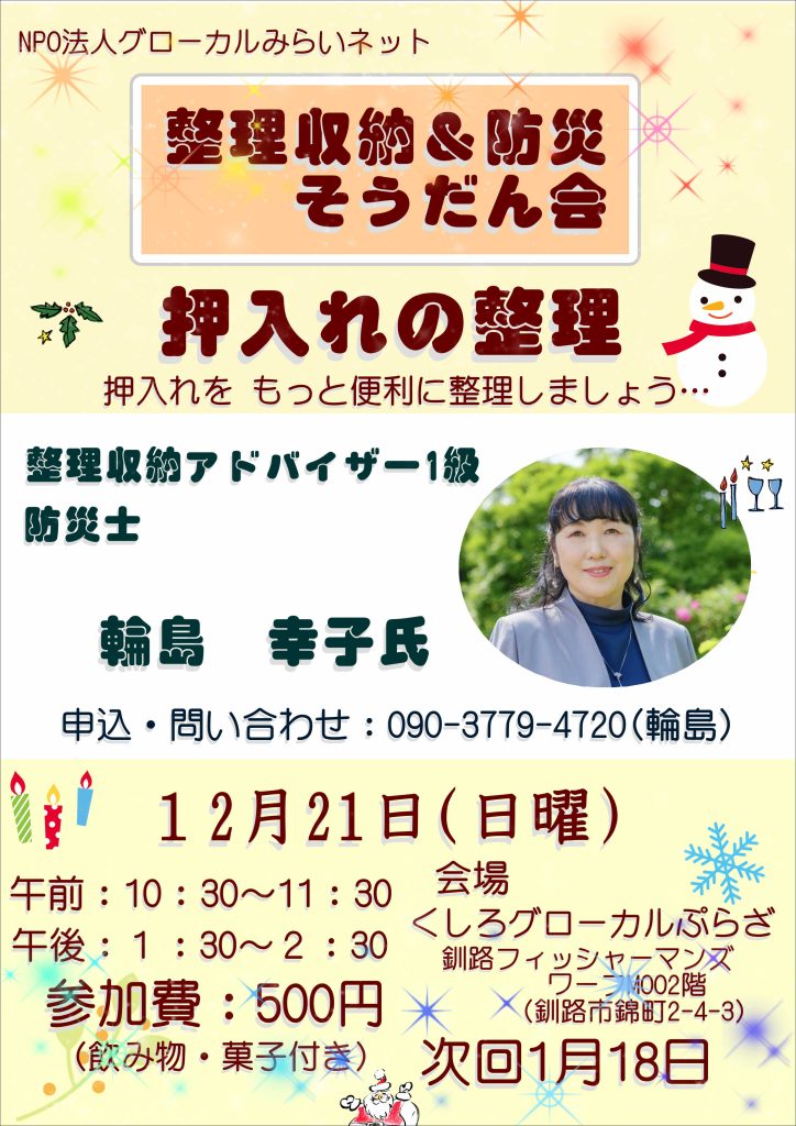 12月21日(日曜)フイシャーマンズワーフMOO2階 『くしろグローカルぷらざ』では 整理収納そうだん会が開かれます。