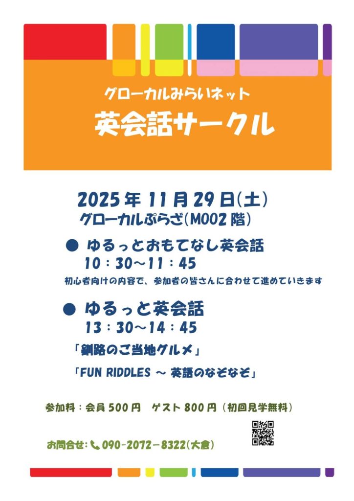 💛ゆるっと英会話 & おもてなし英会話 のご案内 2025年11月23日 最終更新日時 : 2025年11月23日 glocalmirainet グローカルの おもてなし英会話 楽しいですよ(^_-)-☆ 初めての方は 無料体験もできますよ💕 初級から ちょっとだけ中級も 楽しいですよ